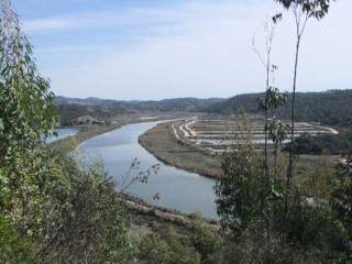 Englischsprachiger Flyer vom Touristenbüro Odemira, liegt auch im Web vor: http://www.cm-odemira.pt/PT/Visitar/FoletosTuristicos/Paginas/default.aspx Vorbemerkung: Wir sind den beschriebenen Weg am 18. Oktober 2010 gewandert, bei sonnigem Wetter bis 24°. Der gesamte Weg ist sehr sonnig, es gibt fast nirgends Schatten. Man sollte also genug Wasser zum Trinken mitnehmen! Außerdem gibt es aufgrund der feuchten Umgebung sehr viele Mücken; ein entsprechender Schutz ist unbedingt empfehlenswert! Wegen der Sumpfwiesen ist auch festes Schuhwerk zu empfehlen, und wegen der vielen Vögel lohnt es sich, ein Fernglas mitzunehmen. Ausgangspunkt ist die Ortmitte von Troviscais (Abzweigung von der N120 zwischen Sao Luis und Odemira). Beim Cafe ist ein kleiner Parkplatz, dort ist auch eine Wandertafel. Der Weg ist im großen und ganzen gut gekennzeichnet. Von Troviscais bis zum Rio Mira folgt man den gut beschilderten Caminhos (Fahrwegen). Das erste Stück führt durch Korkeichenplantagen (etwa 1500 m), dann durch Eukalyptuswald. Hier öffnet sich die Sicht langsam in Richtung auf das Flusstal.